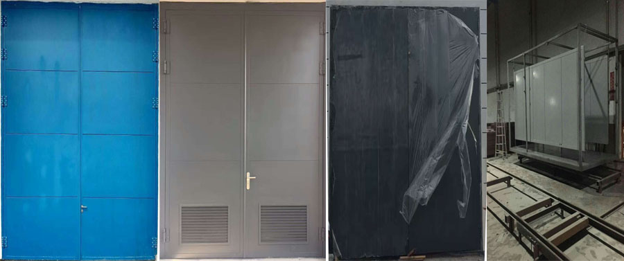 骨架加工制作經檢驗合格后再鋪設面板。一般門型門扇面鋼板可采用點焊、鉚接或螺釘連接。鋼板之間拼縫處應搭接后內外交替斷續點焊或鉚接。加工完后應涂防銹漆一道再涂面漆。保溫門型骨架焊好后涂一道防銹漆,按骨架尺寸加工切割金屬絕熱材料夾芯板,將夾芯板嵌入門扇骨架中,一體鉆孔鉚接或螺釘連接。